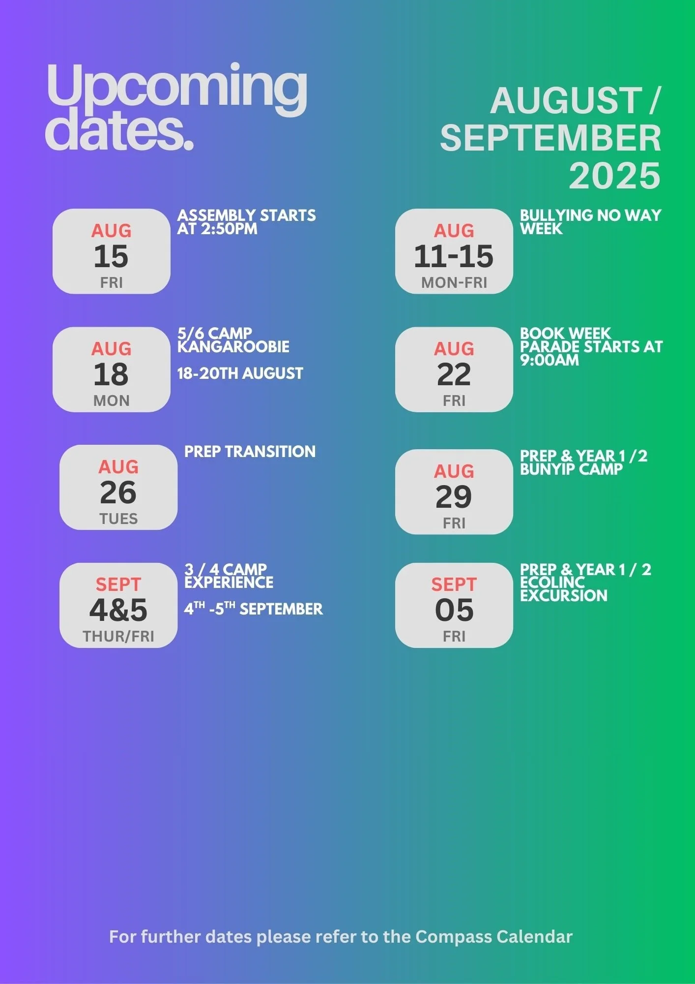 The Parent / Caregiver / Guardian Opinion Survey will be open online from Monday 18 August to Friday 19 September 2025. I will send out the invitation via Compass on Monday.