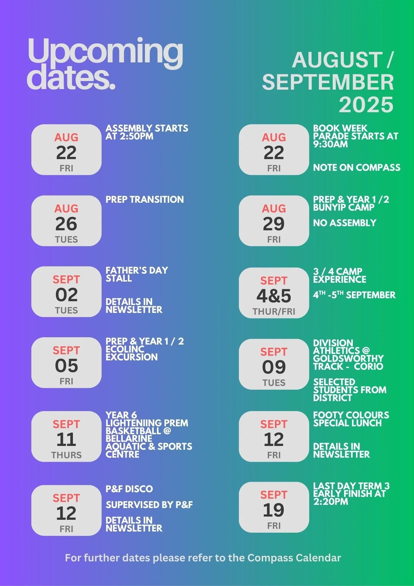 Next week, we welcome our Prep 2026 students for their first transition session. Then on Friday, it’s Bunyip Camp for the Prep, 1s and 2s - keep practising that Bunyip chant! Note: there will be no assembly next Friday 29th August.