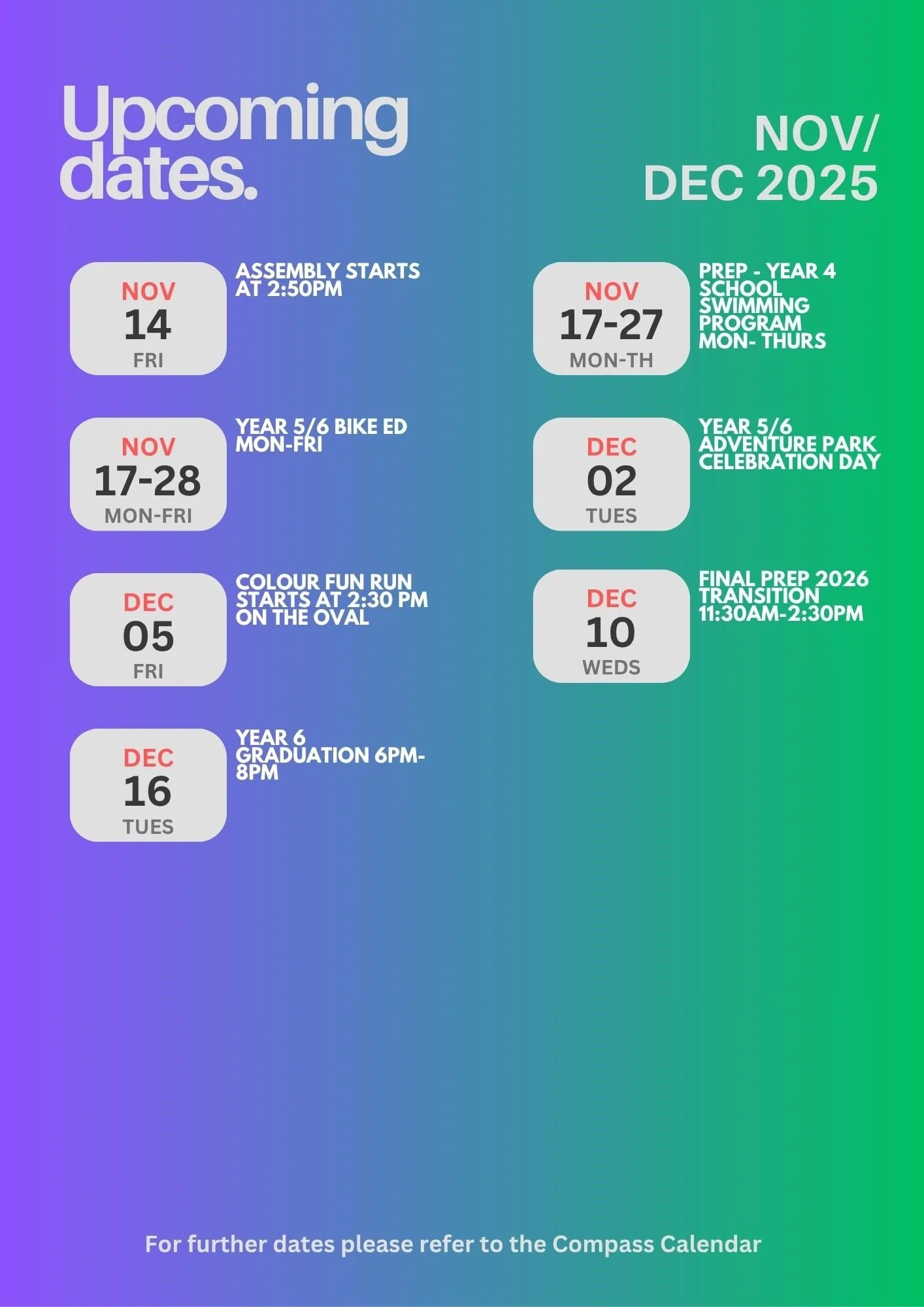 We ask if all parents could please check on Compass if there are any unexplained absences outstanding for their child/children and please provide an explanation (via Compass). Thank you.