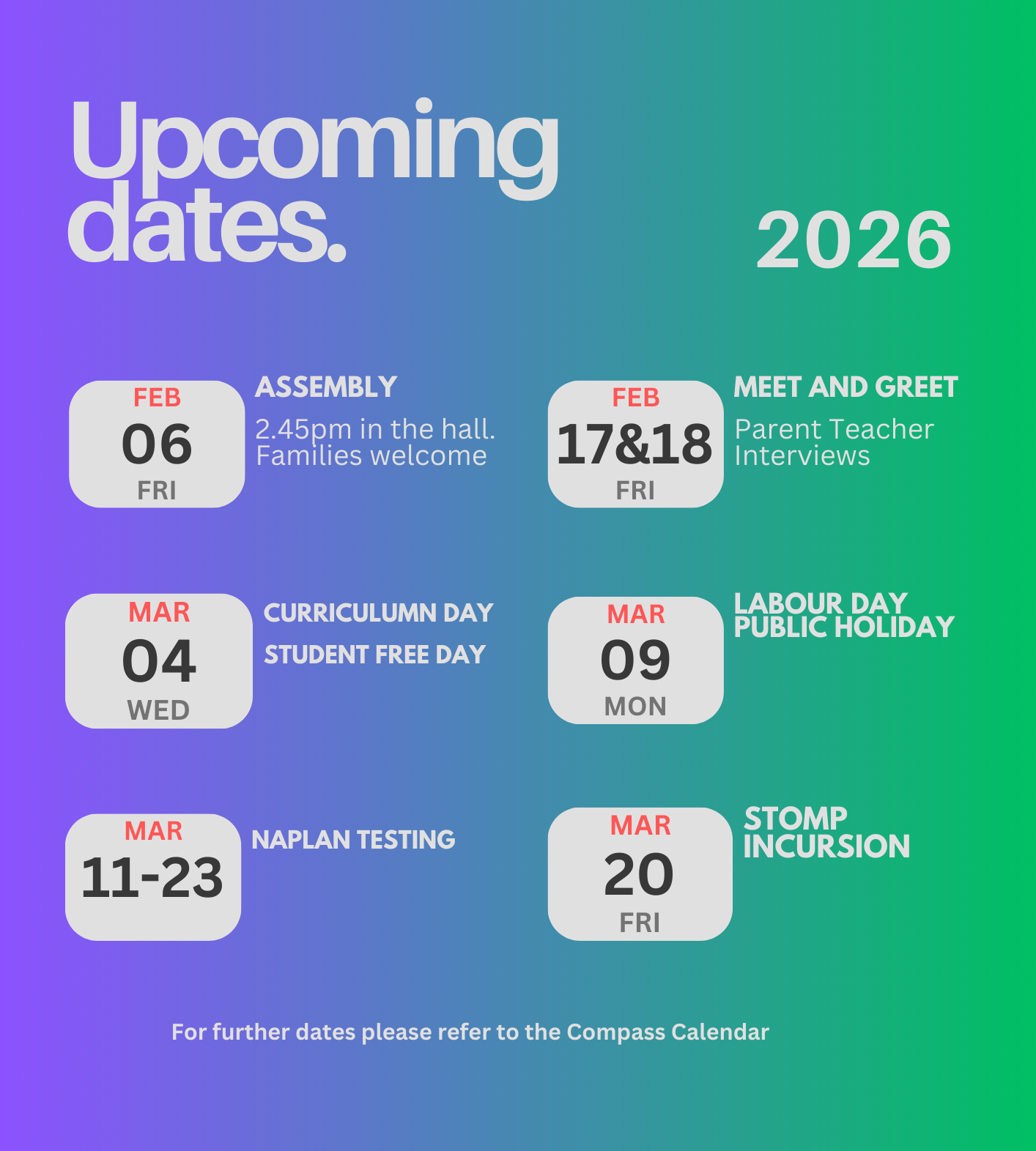Welcome to the first newsletter of 2026! Already nearing the end of week two, students have settled in well to their new classes and have been busy learning the routines and revisiting our School Wide Expected Behaviours. As you may know, the expected behaviour Matrix is available on our website and I would recommend familiarising yourself with the behaviours we encourage each day. Staff will consistently refer to the matrix, reinforcing positive behaviours with praise, acknowledgement and tokens that can be used for rewards through the year.