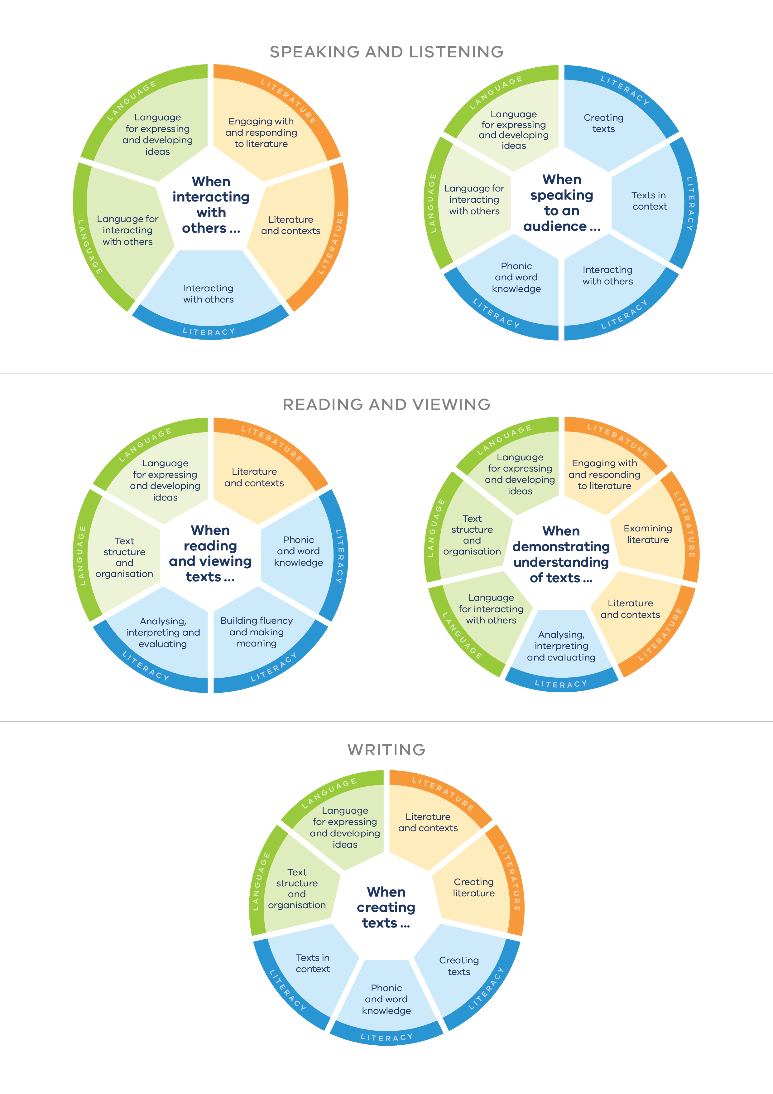 Together, these three areas help students improve in all language skills: Speaking and Listening, Reading and Viewing, and Writing.