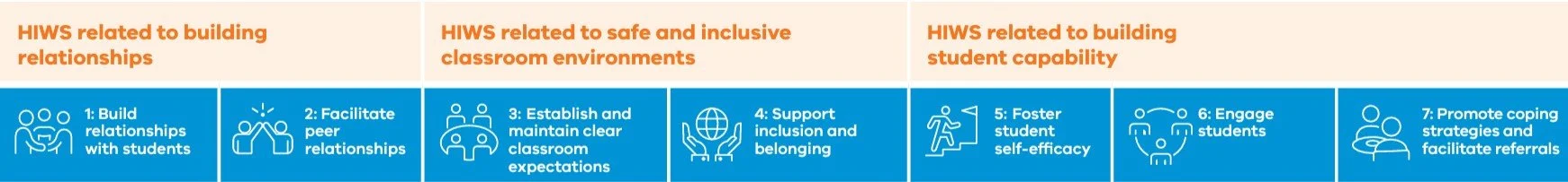 The High Impact Wellbeing Strategies (HIWS), are seven research-based methods created with Monash University to support student wellbeing. These strategies help our school staff learn how to enhance the wellbeing of students effectively. The HIWS are part of the Victorian Teaching and Learning Model (VTLM) and work alongside the High Impact Teaching Strategies (HITS) to improve teaching practices.
