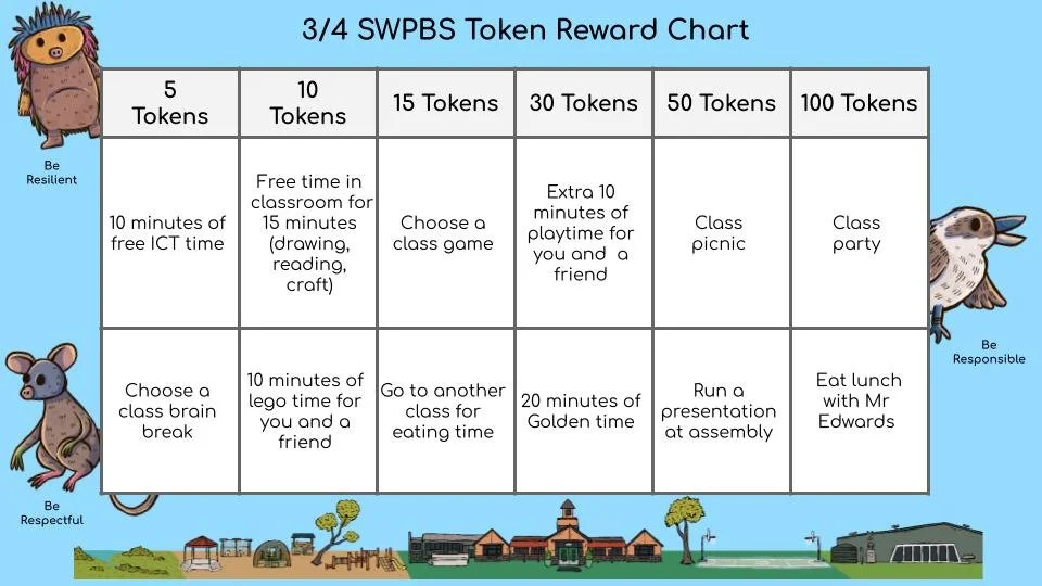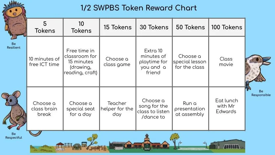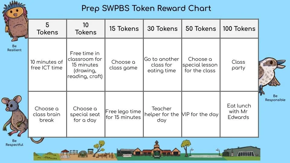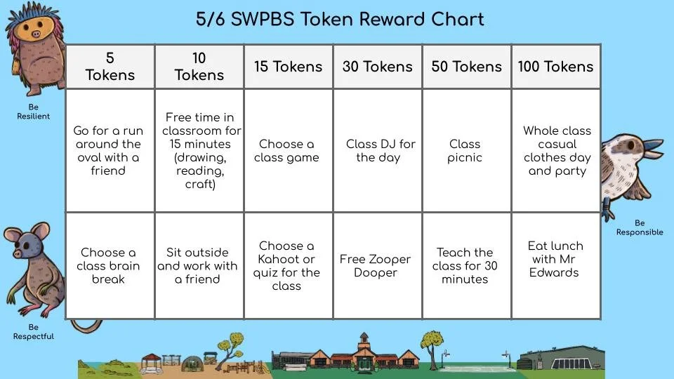 Students receive tokens when they show our expected behaviours and can cash them in for rewards. The charts below are the rewards that the students came up with across the school.