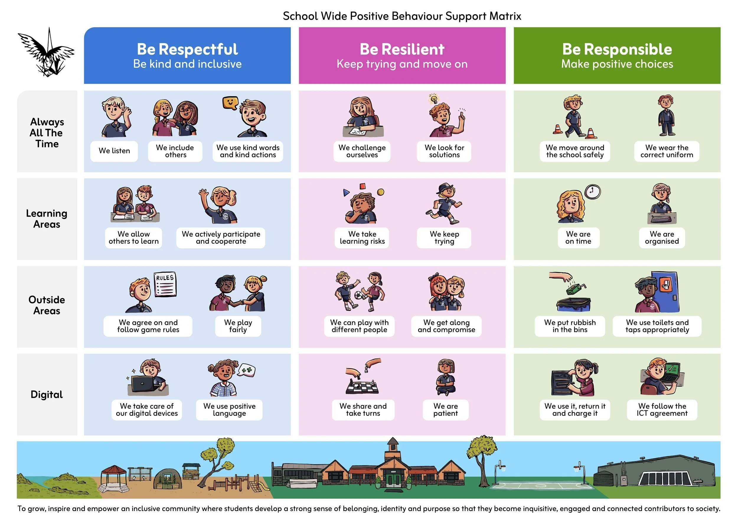 Our SWPBS matrix outlines clear expectations for behaviour in different areas of the school, such as the classroom, playground, and safety online. It provides a consistent framework that supports all students to thrive, ensuring they feel safe, respected, and empowered to succeed.